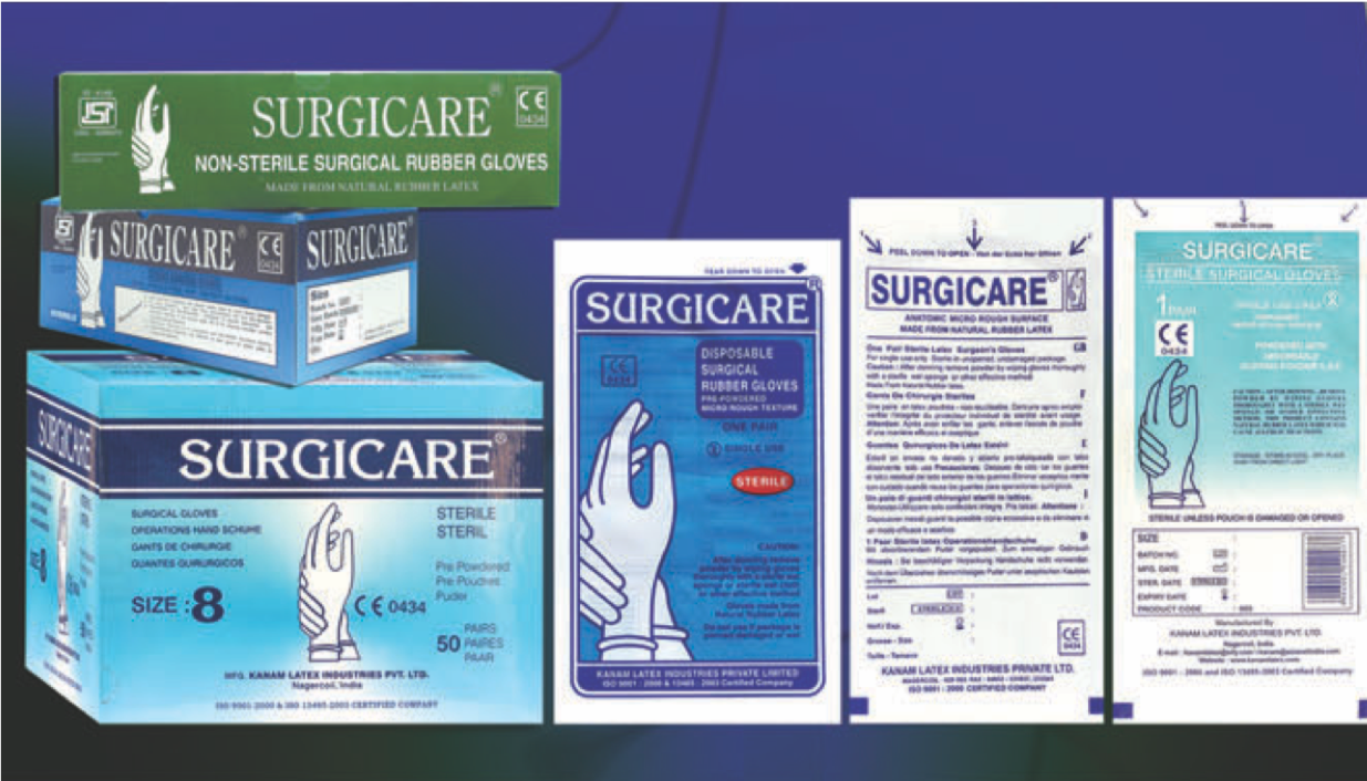 Surgicare GlovesKanam Latex is India's Largest Manufacturer and Exporter of Latex Surgical gloves and Examination gloves.STERILE LATEX POWDERED SURGICAL GLOVES - Latex Prepowdered Surgical Gloves lightly powdered with Modified Bio-Absorbable Corn starch USP Grade (No talc), to prevent wound infections and granulomas. |